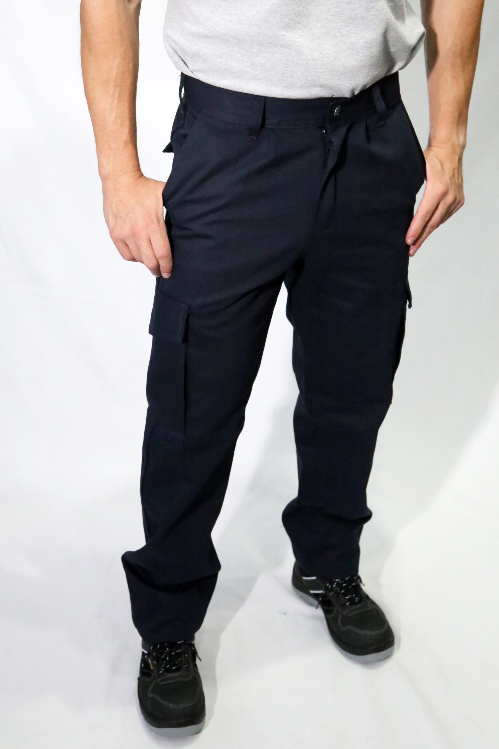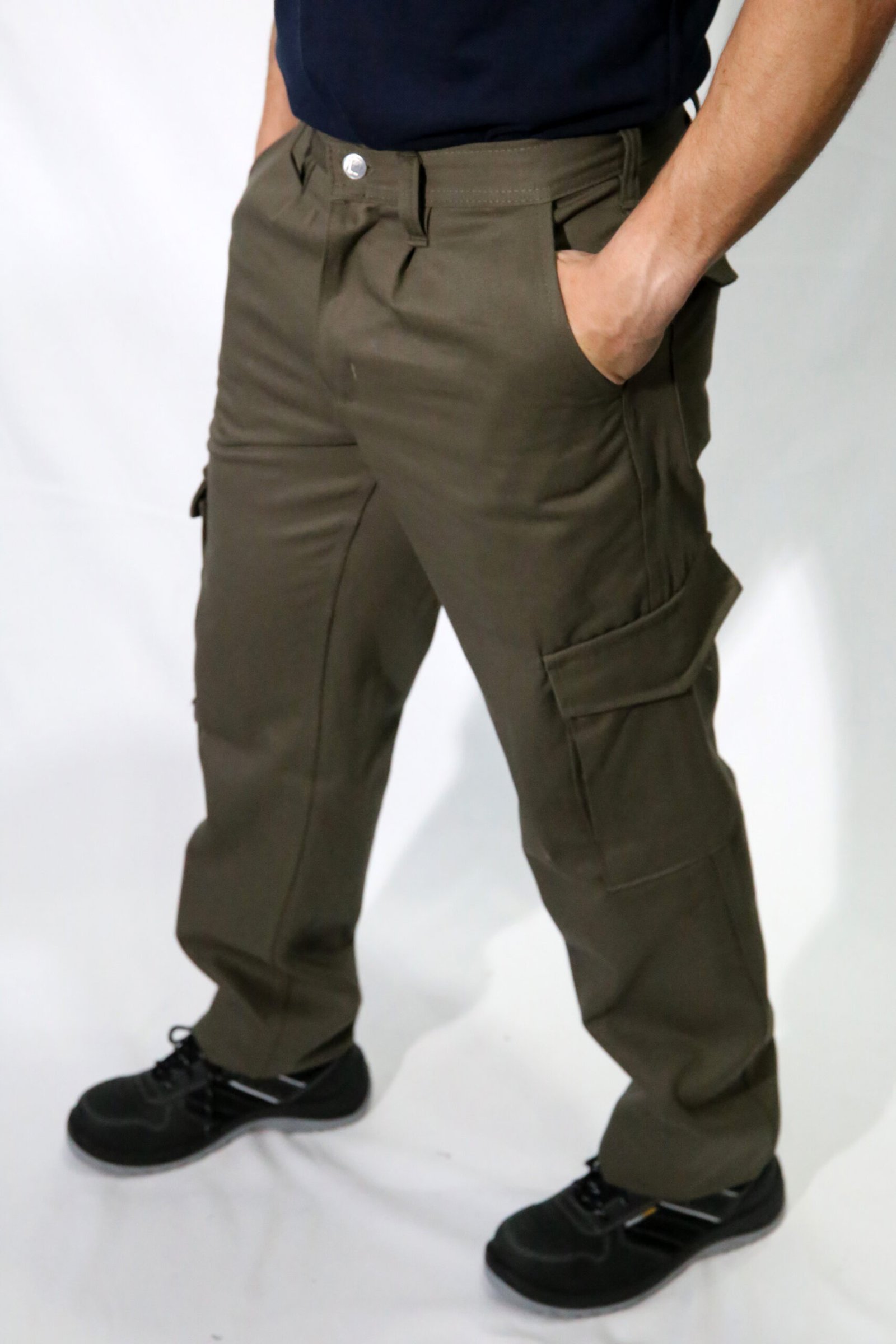 Pantalón de trabajo tipo cargo de gabardina de 8 onzas con proceso sanforizado, 6 bolsillos (2 laterales), confeccionado con triple costura y reforzado con atraques en los puntos de mayor esfuerzo. Forreria de la misma tela